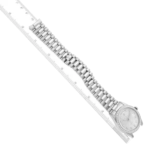Bracelet: 18k white gold presidential bracelet with a hidden folding clasp. Fits a 7.5″ wrist.
