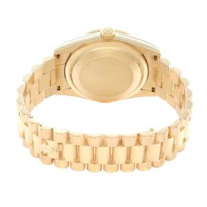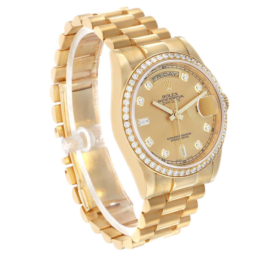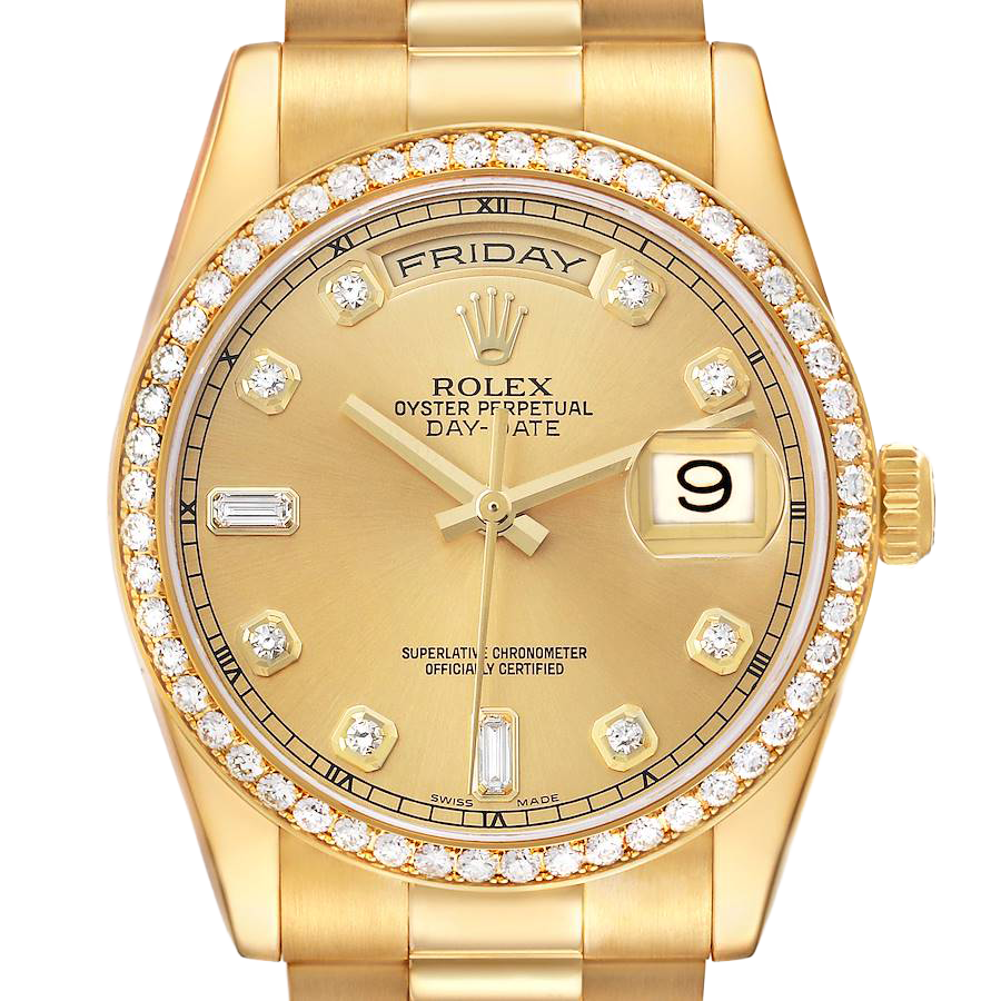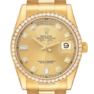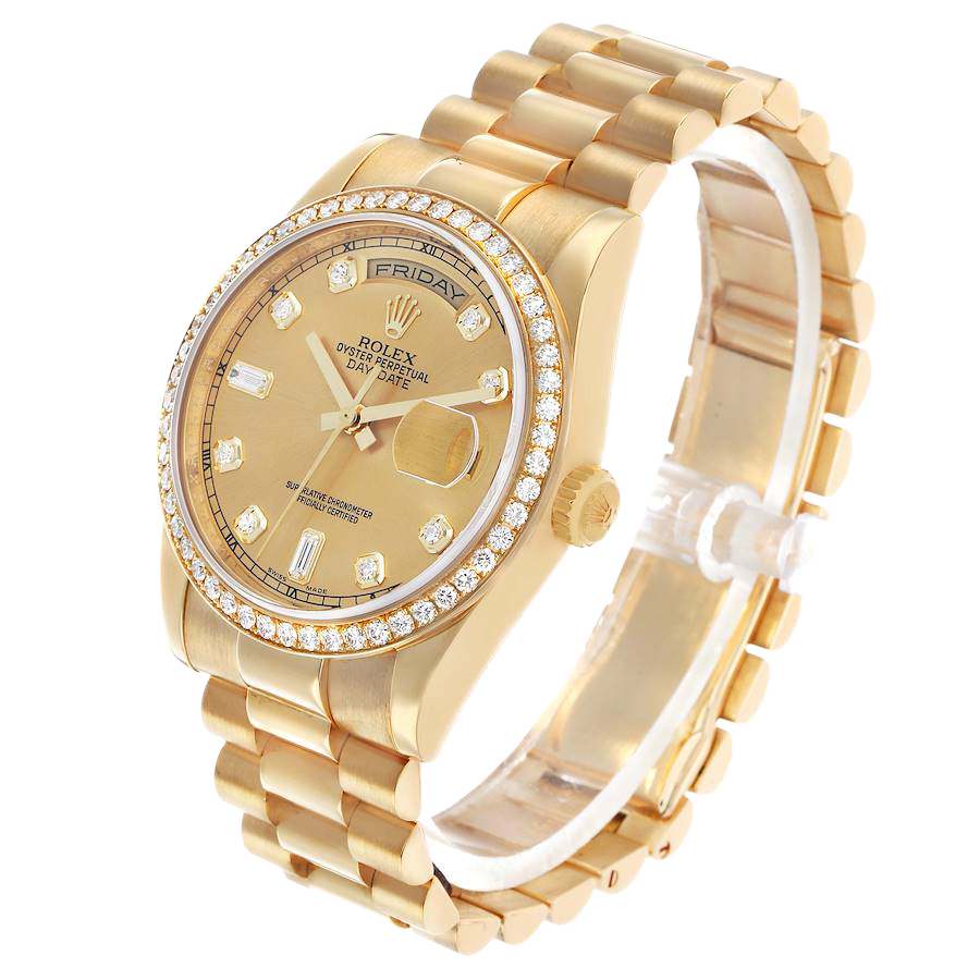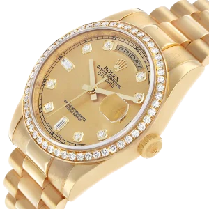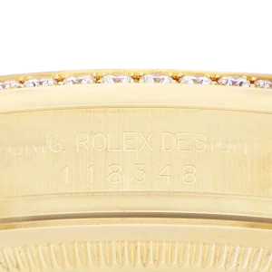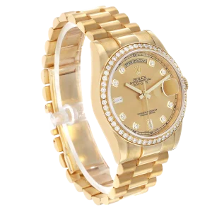 Model Name: Rolex President Day-Date Yellow Gold Diamond Bezel Mens Watch 118348