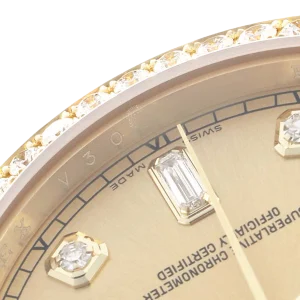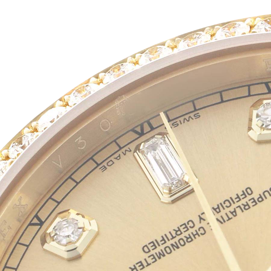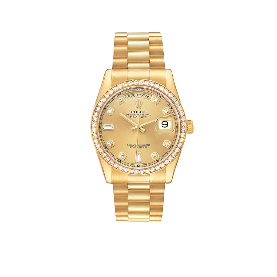 Dial: Champagne dial with original Rolex factory diamond hour markers and yellow gold baton hands. Weekday aperture at 12 o’clock. Date aperture at 3 o’clock.