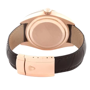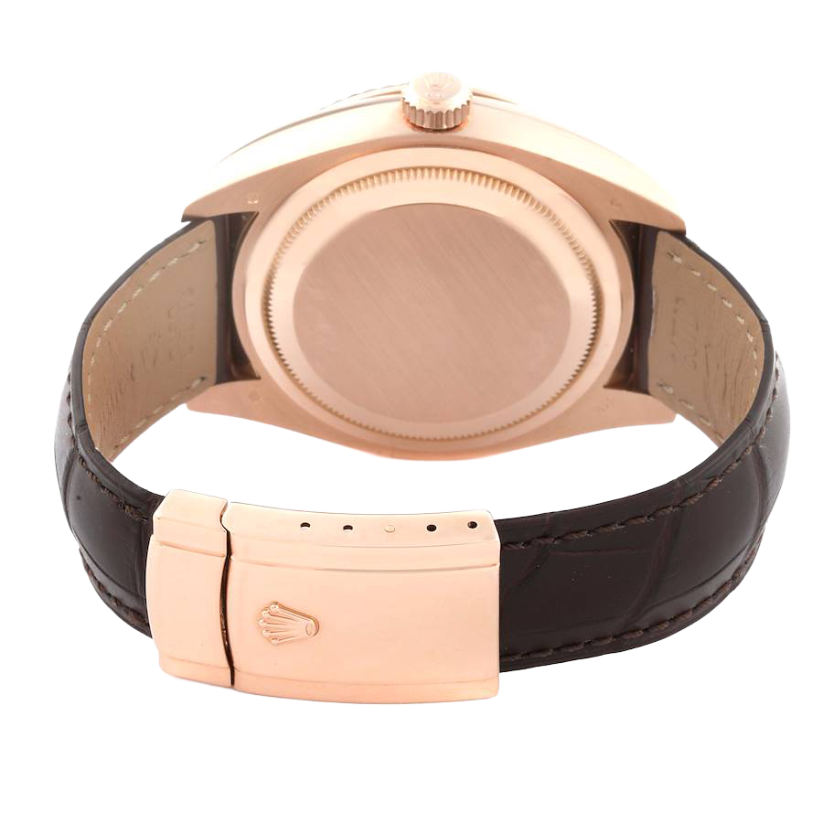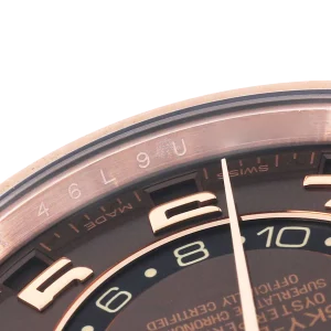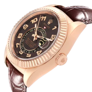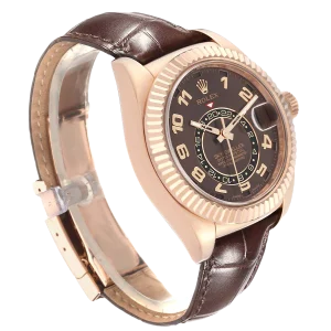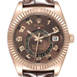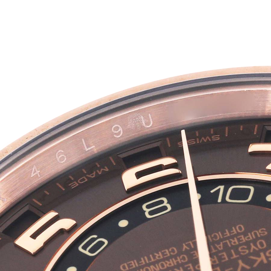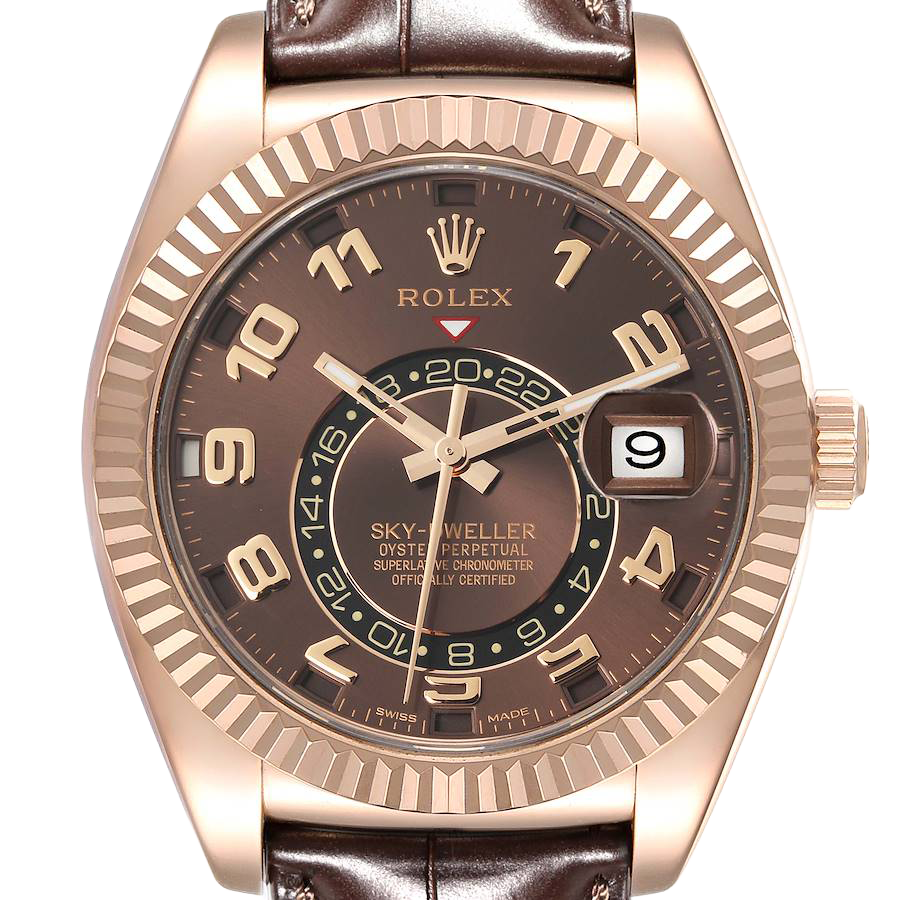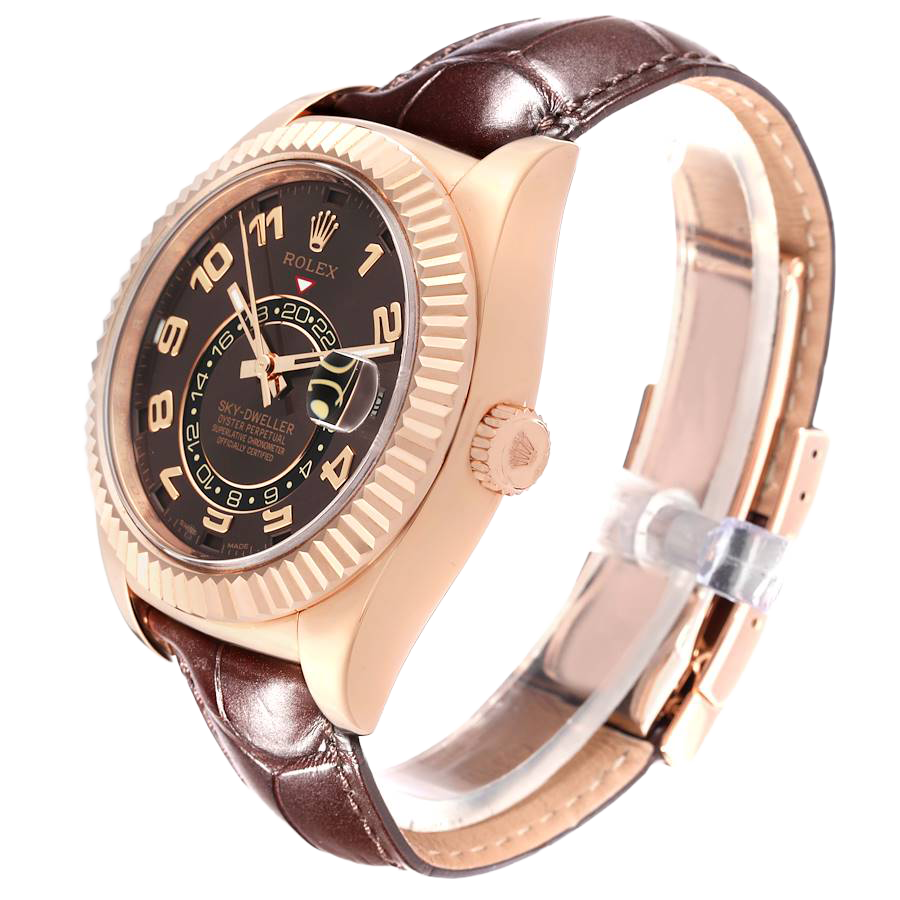 Rolex Sky-Dweller Everose Chocolate Brown Dial Rose Gold Watch 326135 Box Card. Officially certified chronometer automatic self-winding movement. 18K rose gold case 42.0 mm in diameter. Rolex logo on a screw-down twinlock crown. 18K rose gold fluted rotatable ring command bezel. Scratch resistant sapphire crystal with cyclops magnifier. 18K rose gold fluted rotatable ring command bezel. Chocolate brown dial with raised rose gold arabic numerals. Centre hour, minute and seconds hands. 24-hour display on off-centre disc. Second time zone. Instantaneous annual calendar at 3 o’clock and rapid-setting of the date. Month display via 12 apertures around the circumference of the dial.