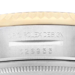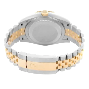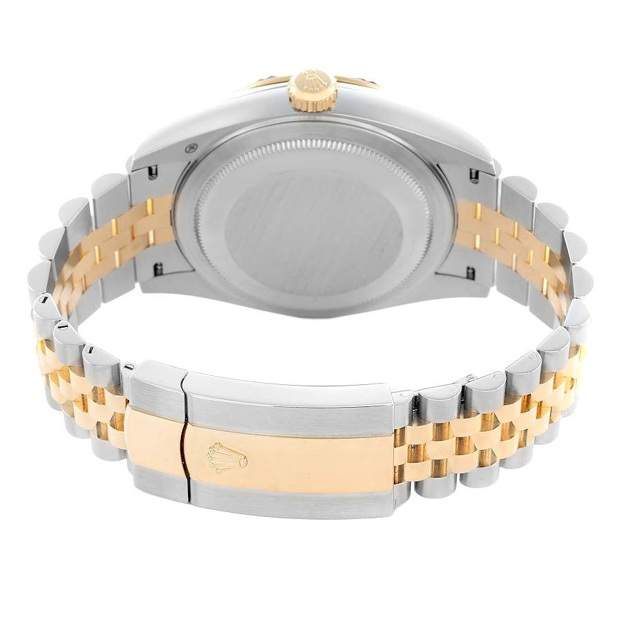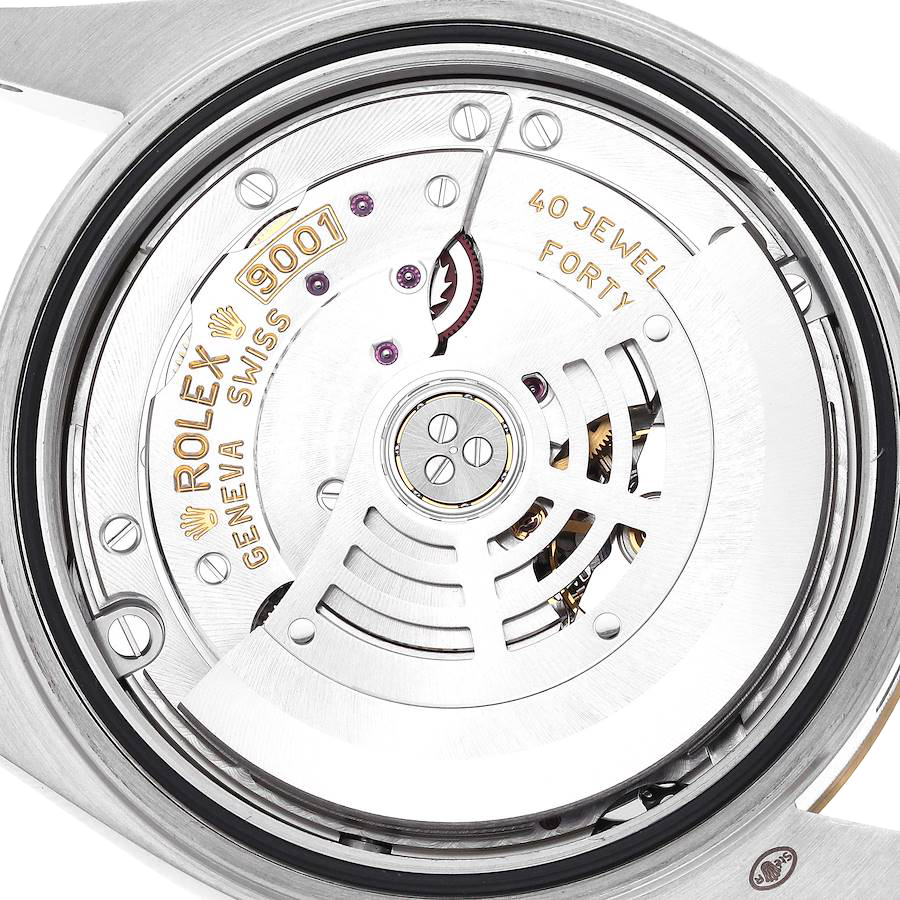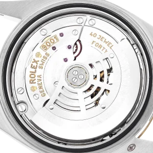 Bracelet: Stainless steel and 18k yellow gold jubilee bracelet with an oysterlock clasp. Fits up to a 7 3/4″ wrist.