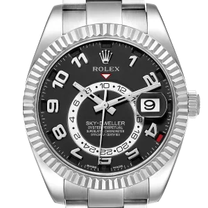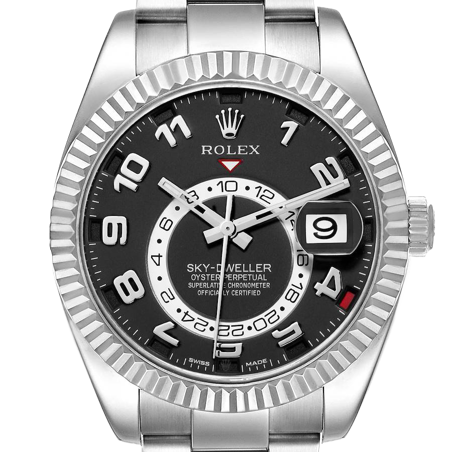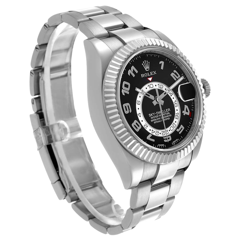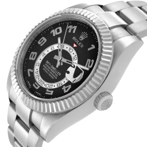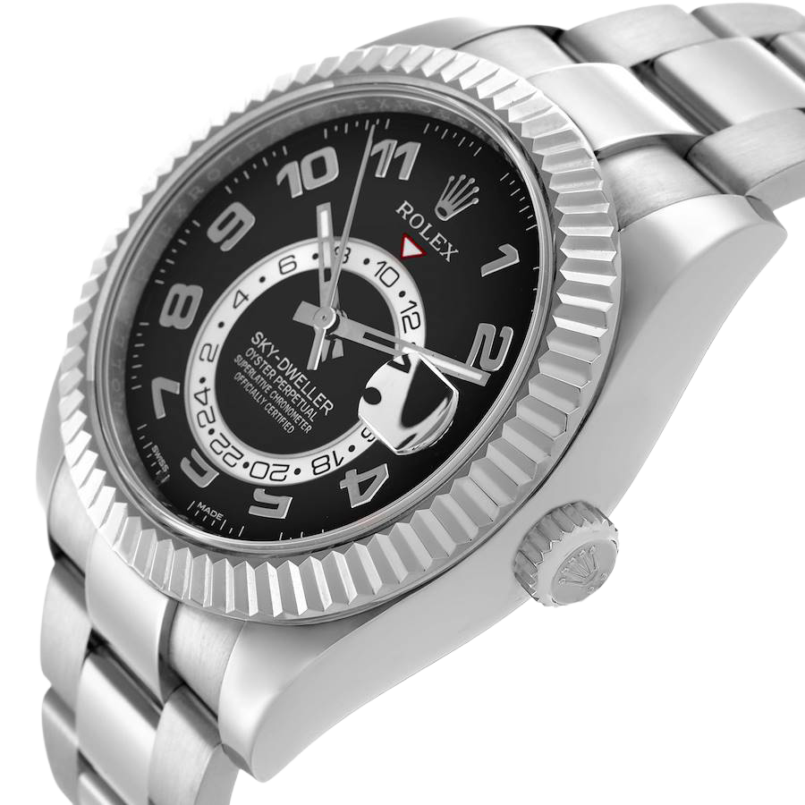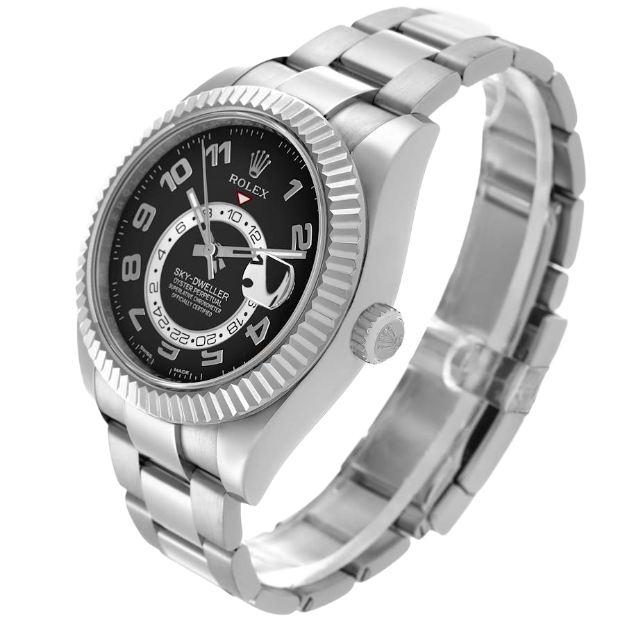 Rolex Sky-Dweller White Gold Black Dial Mens Watch 326939. Officially certified chronometer automatic self-winding movement. 18k white gold case 42.0 mm in diameter. Rolex logo on the screw-down twinlock crown. 18K white gold fluted rotatable 90-degree ring command bezel. Scratch resistant sapphire crystal with cyclops magnifier. Black dial with raised white gold Arabic numeral hour markers and baton hands. 24-hour display on off-centre disc. Second time zone subdial at 6 o’clock. Instantaneous annual calendar at 3 o’clock with rapid-setting of the date. Month display via 12 apertures around the circumference of the dial. 18k white gold bracelet with an oysterlock clasp.