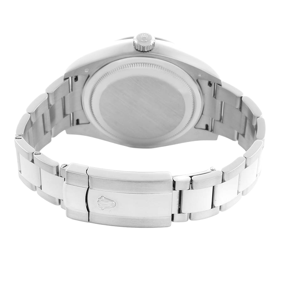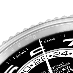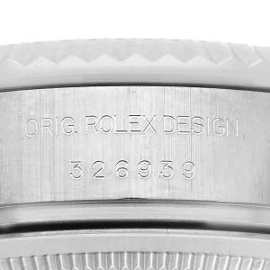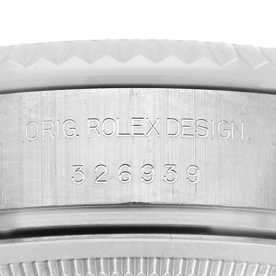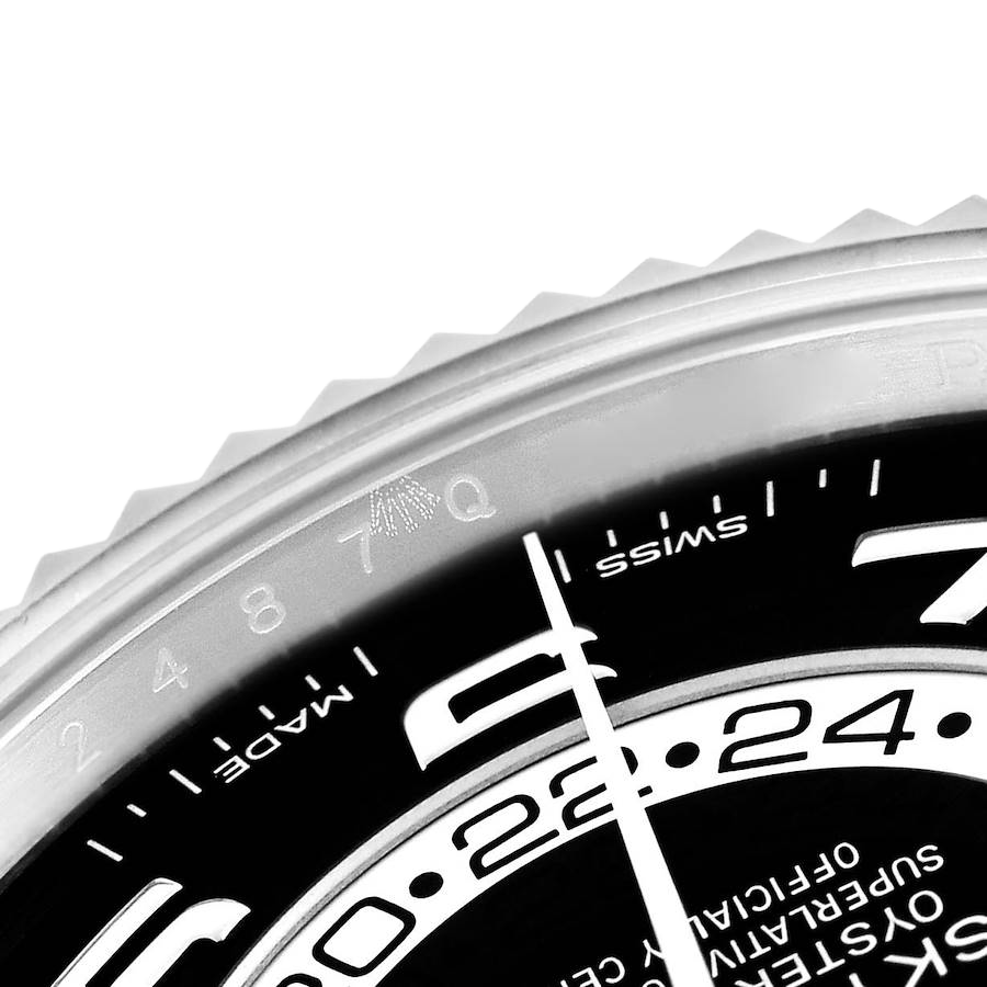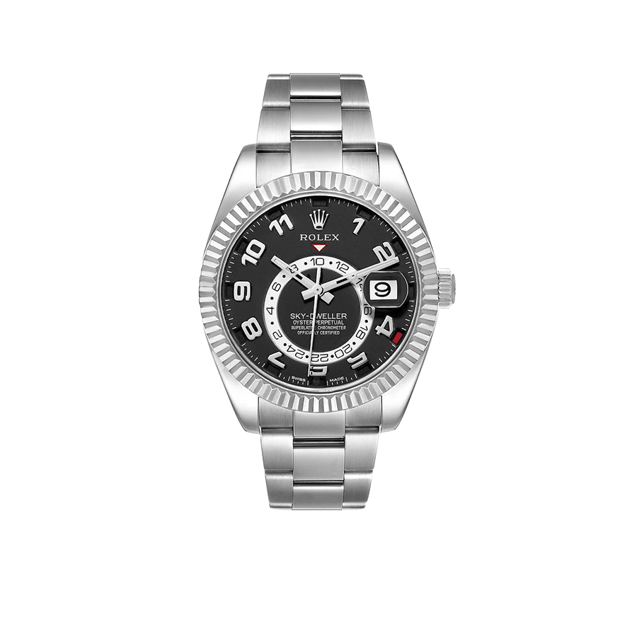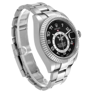 Rolex Sky-Dweller White Gold Black Dial Mens Watch 326939. Officially certified chronometer automatic self-winding movement. 18k white gold case 42.0 mm in diameter. Rolex logo on the screw-down twinlock crown. 18K white gold fluted rotatable 90-degree ring command bezel. Scratch resistant sapphire crystal with cyclops magnifier. Black dial with raised white gold Arabic numeral hour markers and baton hands. 24-hour display on off-centre disc. Second time zone subdial at 6 o’clock. Instantaneous annual calendar at 3 o’clock with rapid-setting of the date. Month display via 12 apertures around the circumference of the dial. 18k white gold bracelet with an oysterlock clasp.