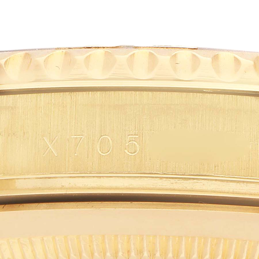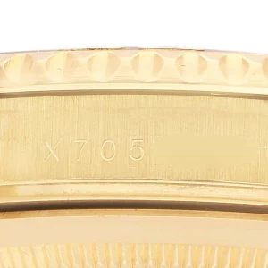 Dial: White dial with yellow gold-outlined original Rolex factory sapphire dot hour markers. Luminescent yellow gold Mercedes hands with a lollipop-tipped center second hand. Date calendar at the 3 o’clock aperture. Outer stick minute markers.
